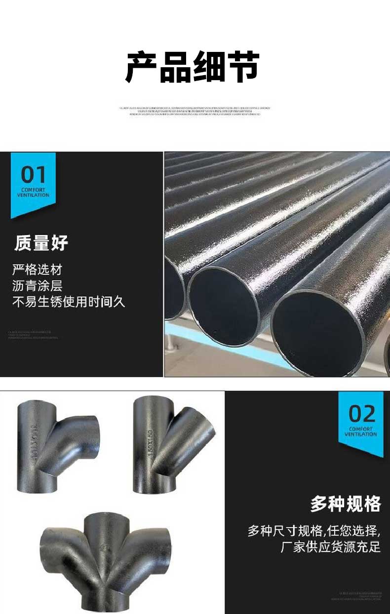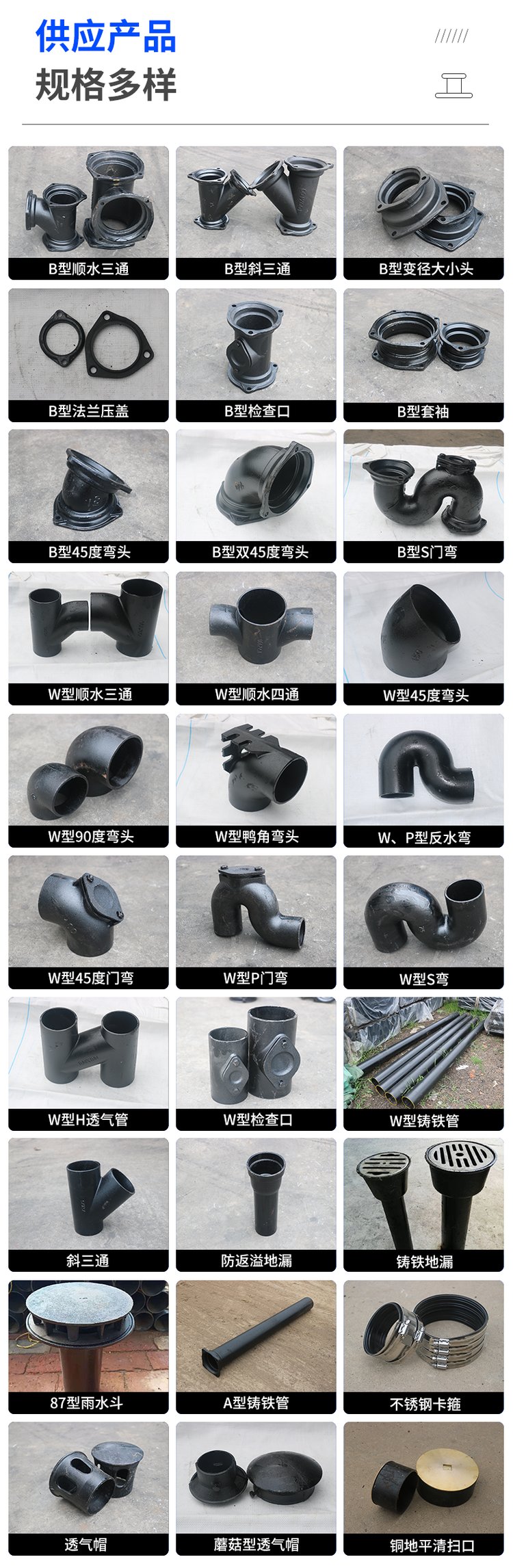 B型雙承變徑屬于金屬型離心鑄造,組織致密,抗拉強度高;其壁厚均勻表面光滑;采用柔性接口連接,橡膠圈密封,具有良好的抗震性能,同時它又能阻滯噪音傳遞,為最安靜管道;該管材能承受高溫,防火性能好,可滿足消防安全需要;它耐腐蝕,抗老化,使用壽命長。B型雙承變徑柔性鑄鐵排水鑄鐵管是理想的高層建筑及超高層建筑的排水管材。